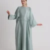 Miyar Jalabiya is crafted from Barbie crepe fabric in a vibrant orange tone, accented with bold fuchsia details, An inner waist belt defines the silhouette, while side slits add fluid movement and comfort. A modern design with a confident, elegant appeal.