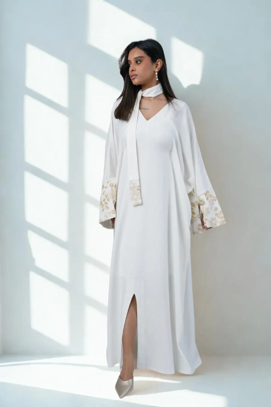 تصميم أنيق وبسيط، مصنوعة من قماش اللنن الخفيف والمريح. تأتي بقصة ناعمة مع حزام داخلي يحدد الخصر ليمنح مظهرًا أنثويًا متوازنًا، إضافة إلى لفة أنيقة على الرقبة تضيف لمسة عصرية راقية