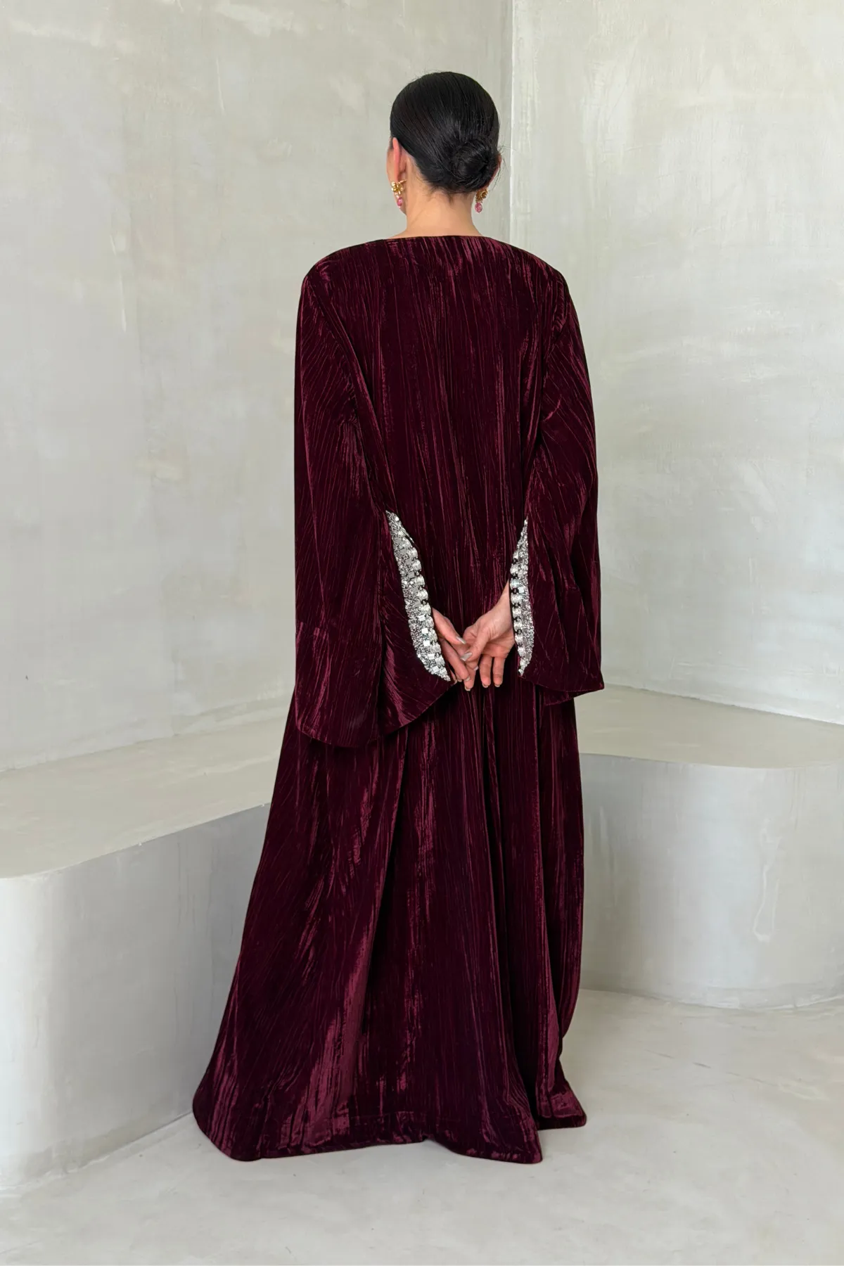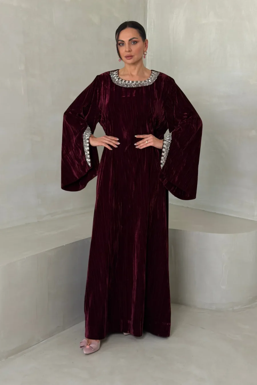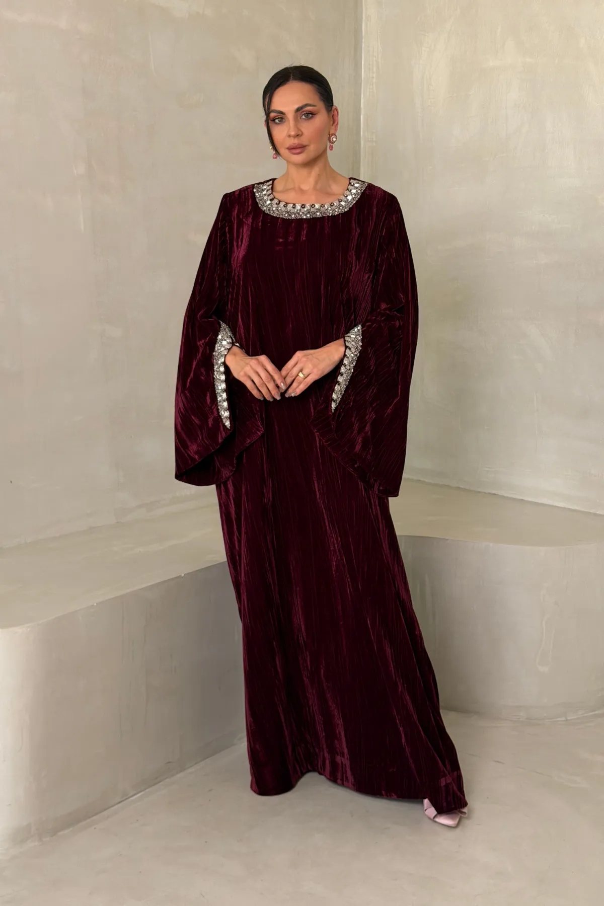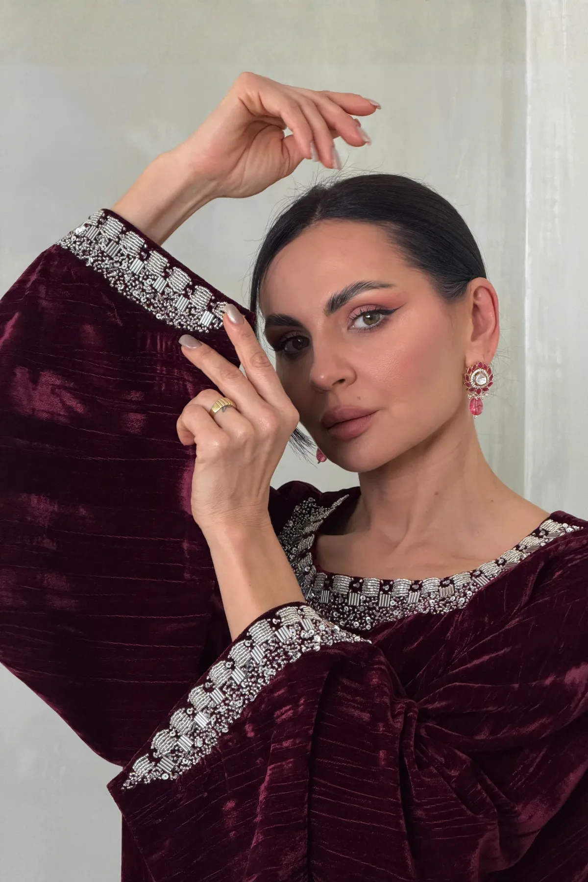 Alaa velvet kaftan crafted from luxurious velvet fabric, featuring a round neckline with hand embellishment and matching embellished sleeves. Designed in a flowing silhouette for an elegant look.
