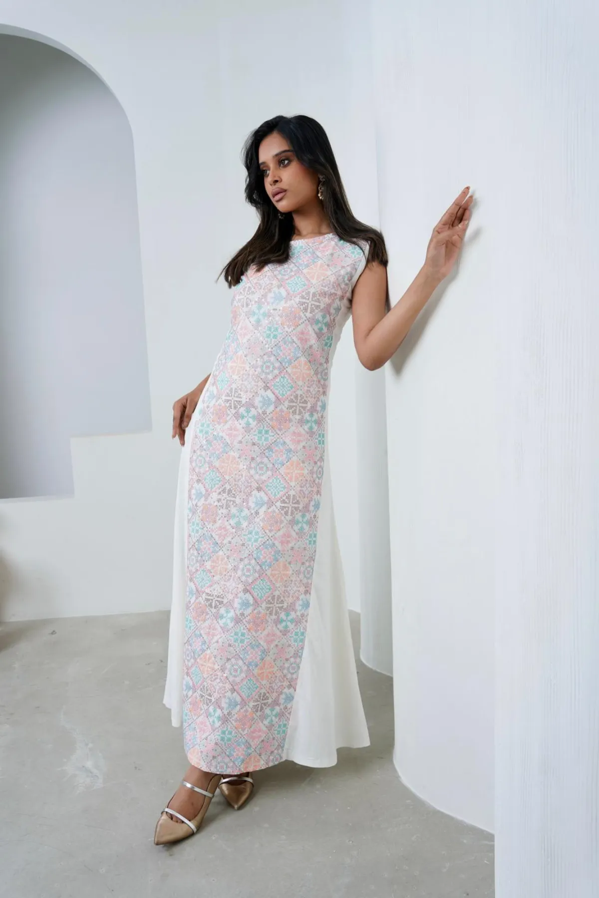 Hanouf two-piece kaftan set crafted from lightweight linen, featuring an embroidered inner panel with elegant detailing, layered with a flowing outer piece for a refined and balanced look.