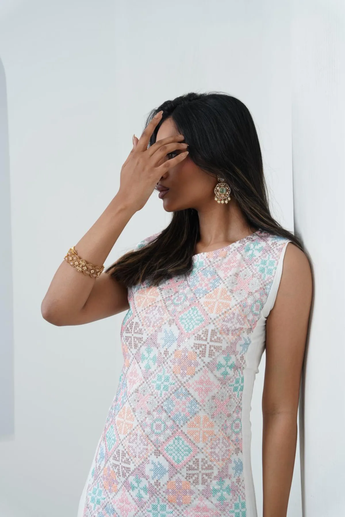 طقم قطعتين من قماش اللنن، تتميز بقطعة داخلية مشكوكة بنقشة أنيقة تضيف لمسة فاخرة، مع طبقة خارجية انسيابية تمنح توازنًا راقيًا للإطلالة