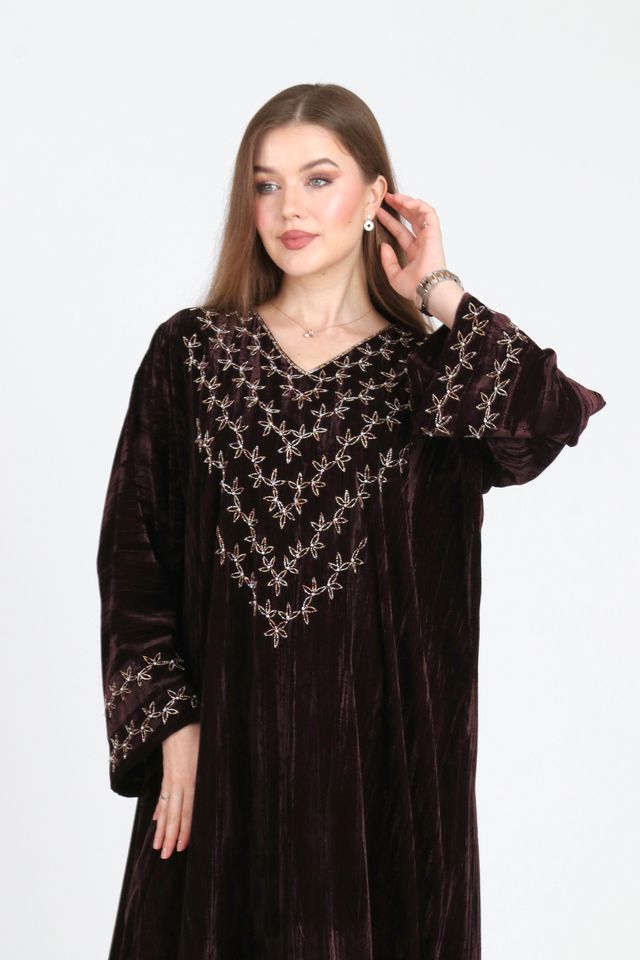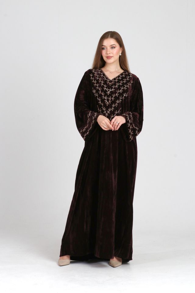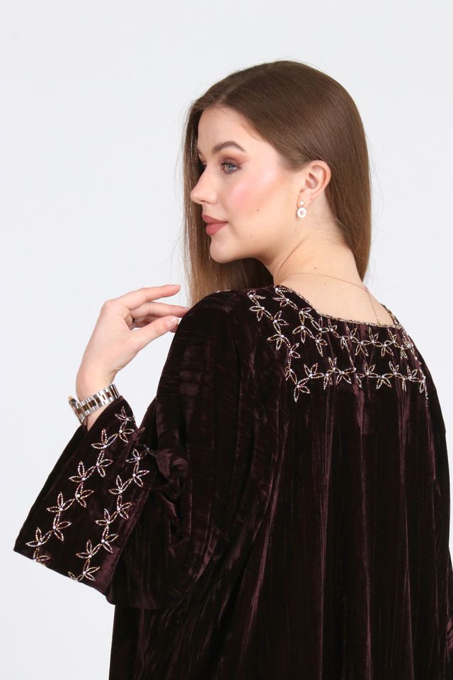 تصميم أنيق من المخمل، مزينة بتفاصيل شغل يد راقية على الصدر والأكمام والظهر تضيف لمسة فنية متوازنة ،القَصّة انسيابية ومريحة