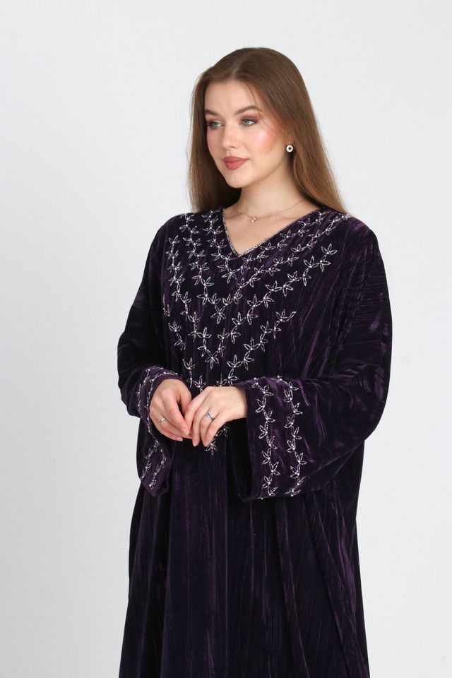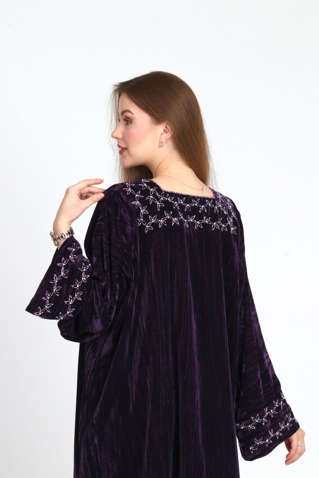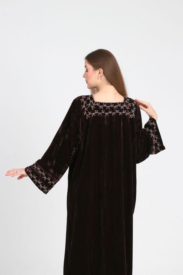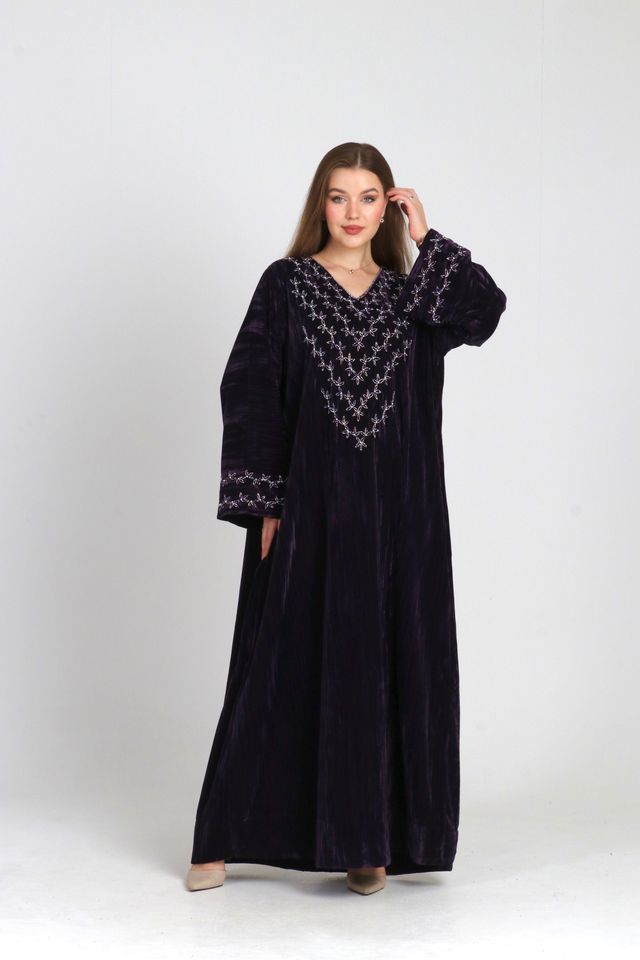 Lina Jalabiya is crafted from velvet, featuring elegant handcrafted embellishments on the chest, sleeves, and back. Designed with a relaxed, flowing silhouette, perfect for refined occasions
