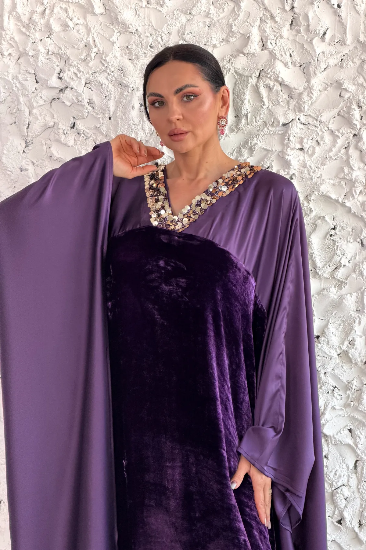 تصميم بقصة فراشة أنيقة يجمع بين قماش مخمل فرنسي فاخر مع ستان ناعم، مزيّن بشك يدوي متقن يبرز تفاصيل القطعة ويمنحها لمسة فخامة راقية. قصة واسعة وانسيابية لإطلالة مميّزة ومريحة