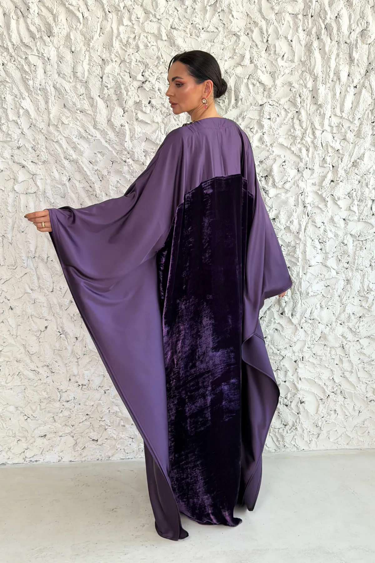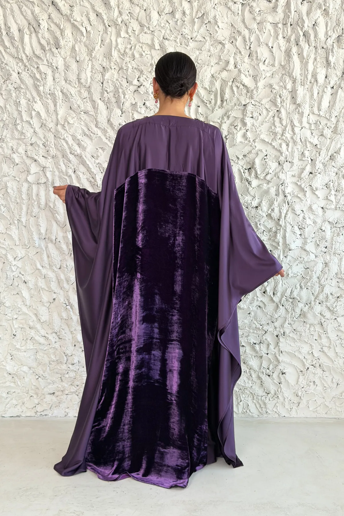 A butterfly-cut design crafted from luxurious French velvet combined with smooth satin, featuring exquisite hand embellishment that enhances the elegance of the piece. Finished with a wide, flowing silhouette for a refined and graceful look