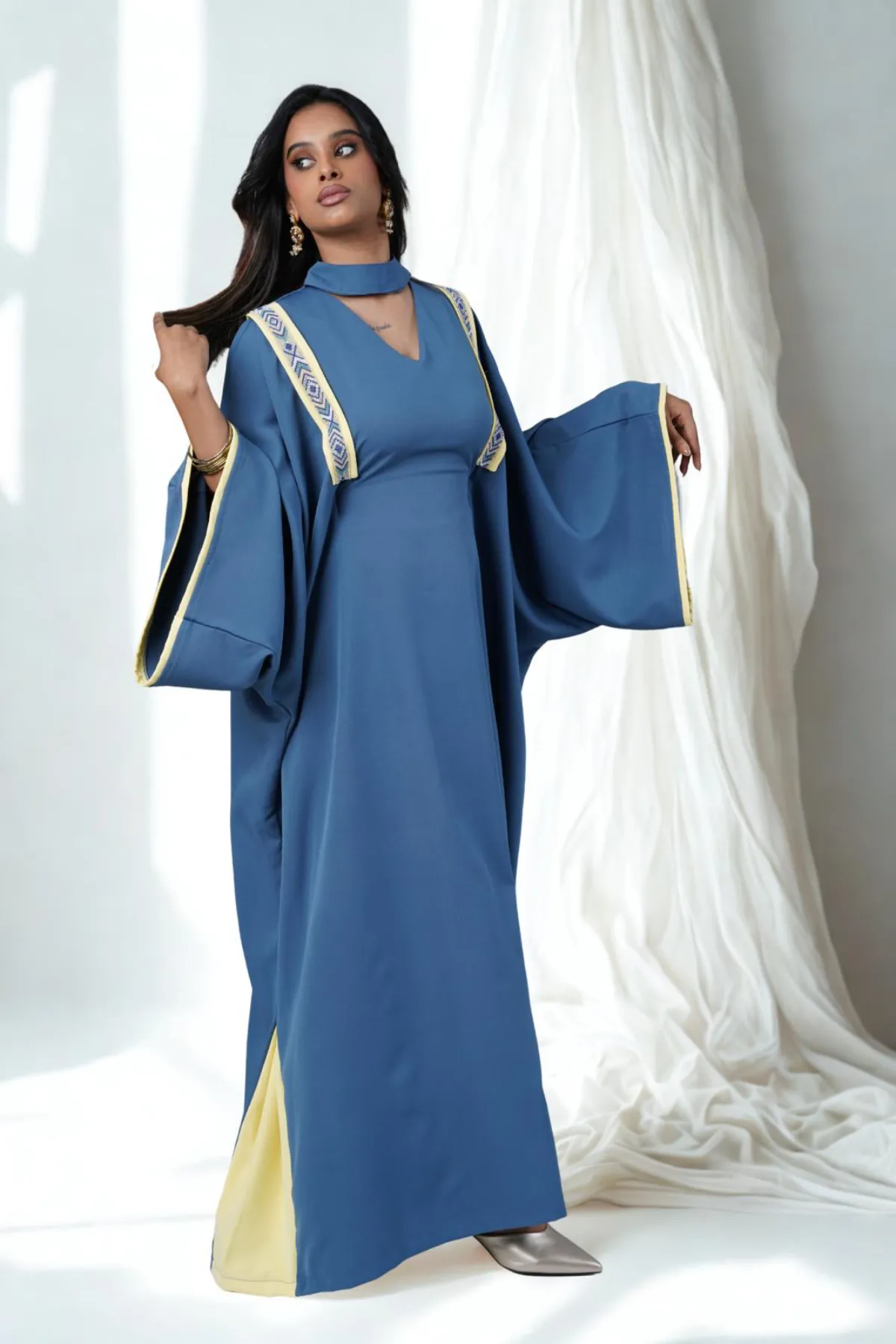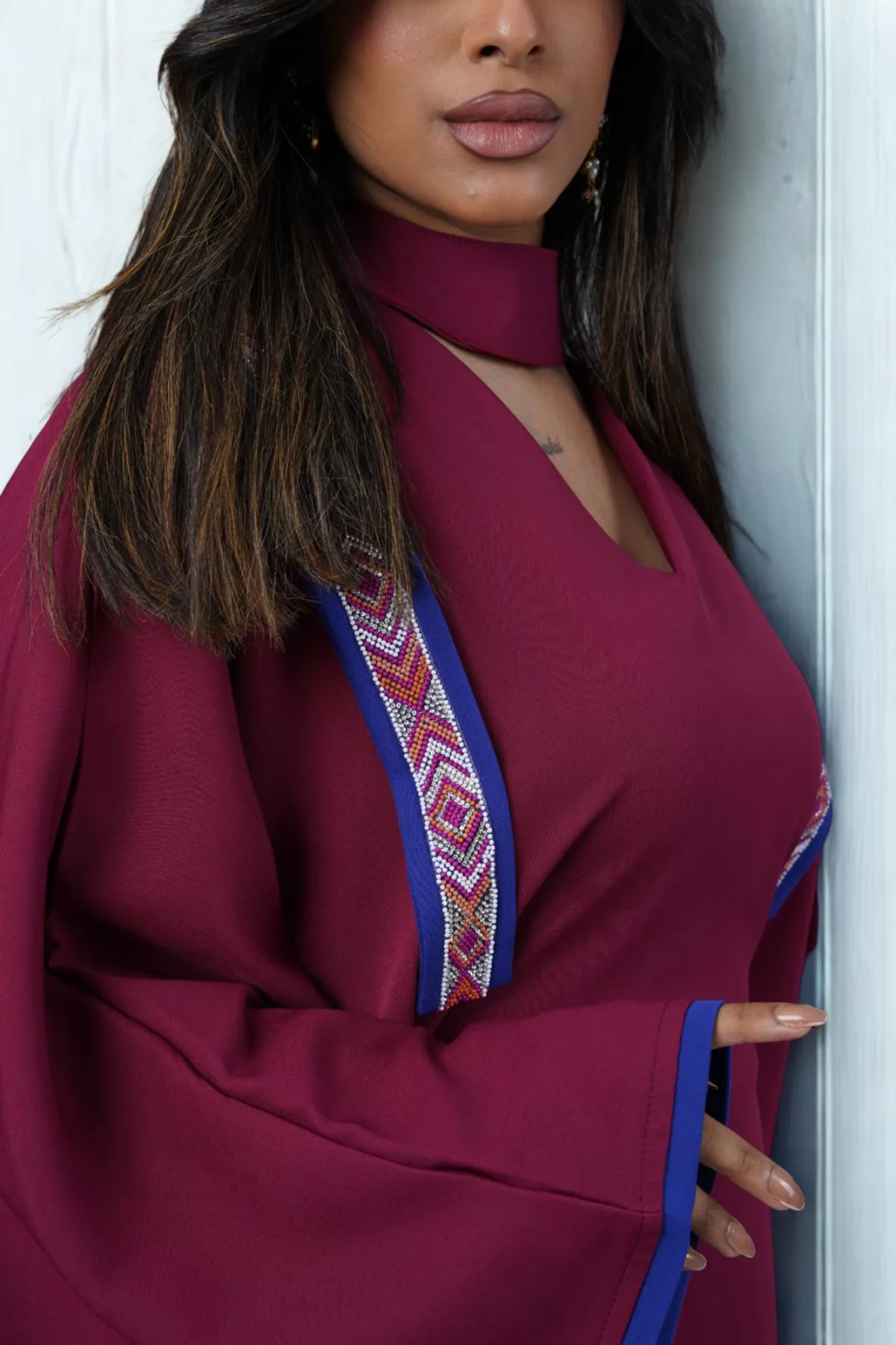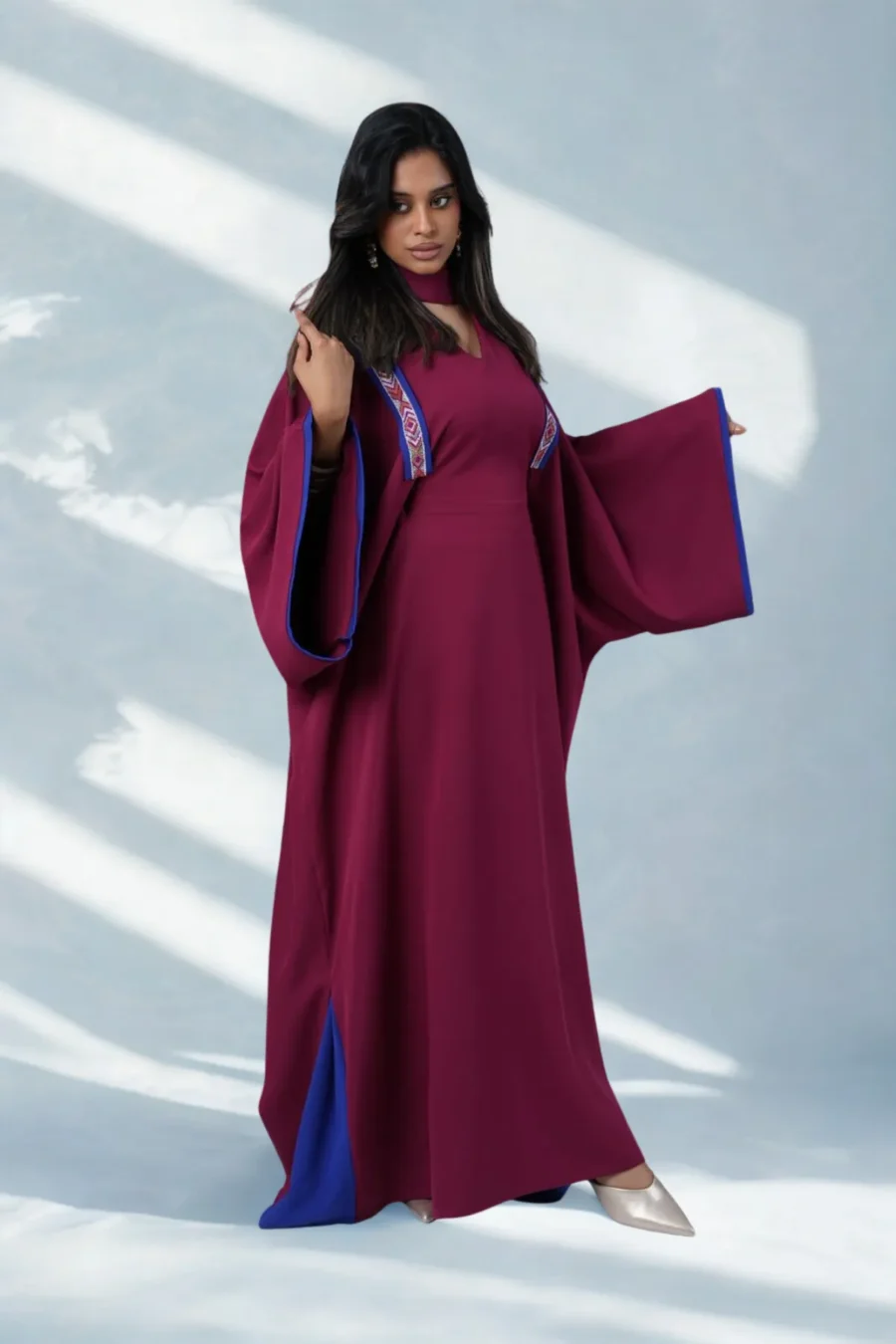 Noura Jalabiya is crafted from crepe fabric in a rich maroon tone with elegant navy accents. A subtle embellished detail adds a refined artistic touch, finished with a flowing, relaxed silhouette