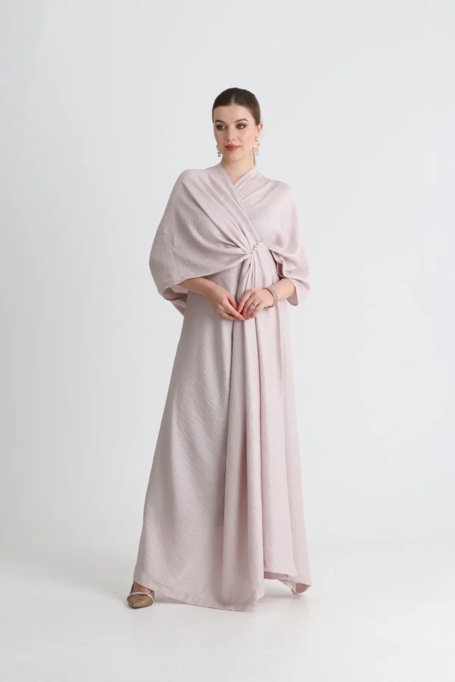 Sara Jalabiya features an elegant silhouette with a refined drape. A pearl and crystal pin adds a delicate, luxurious accent, finished with a comfortable, flowing fit